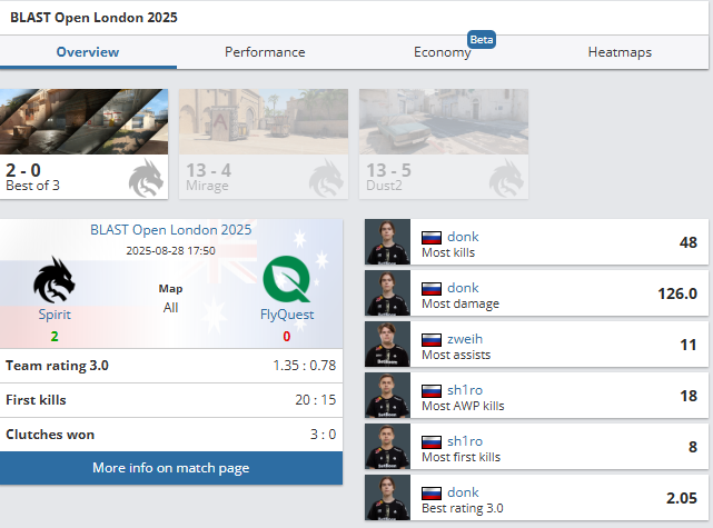 Spirit, которые ранее неудачно выступили на Esports World Cup, вылетев после поражения от HEROIC, на этот раз показали совсем другой уровень игры. Они уверенно разобрались с FlyQuest, а Данил «donk» Крышковец провёл матч с рейтингом 2.05 и swing +9.89%.
