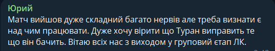 Юрий: Матч получился очень сложен много нервов но надо признать есть над чем работать. Очень хочу верить что Туран исправит то, что он видит. Поздравляю всех нас с выходом в групповой этап ЛК.
