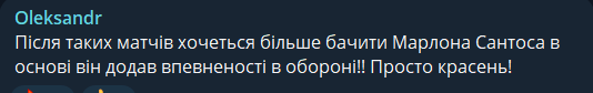 Oleksandr: После таких матчей хочется больше видеть Марлона Сантоса в основе, он добавил уверенности в обороне!! Просто красавец!