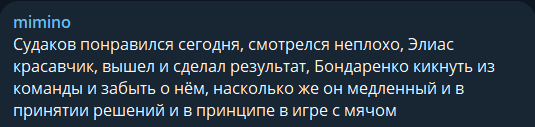 mimino: Судаков понравился сегодня, смотрелся неплохо, Элиас красавчик, вышел и сделал результат, Бондаренко кикнуть из команды и забыть о нём, насколько же он медленный и в принятии решений и в принципе в игре с мячом.