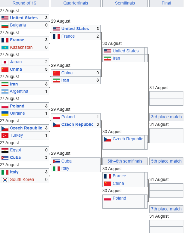 В полуфинале Иран встретится с молодежной командой США, которая одолела французов в напряженном поединке. Китай будет играть в матче за 8–5 места, где первым соперником станет Франция.