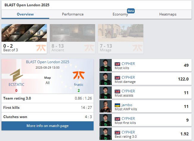 fnatic сохранили шансы на BLAST Open London 2025, одержав победу со счетом 2:0 над ECSTATIC. Европейский коллектив без особых проблем переиграл датчан на Ancient (13:8) и Mirage (13:7).