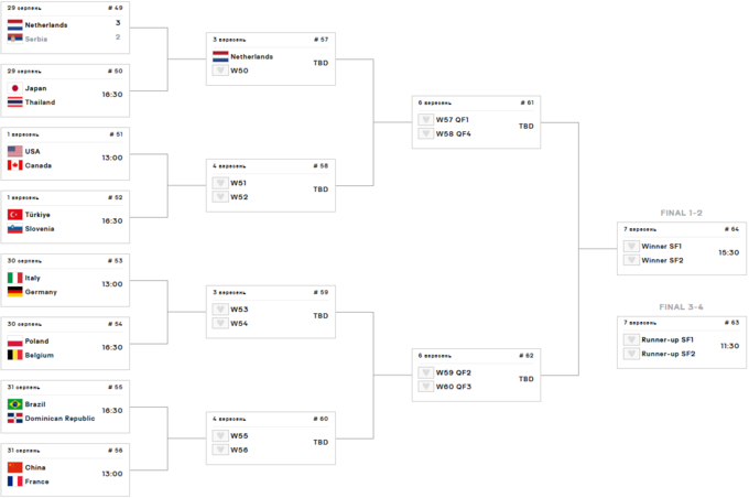 В четвертьфинале Нидерланды сыграют с победителем пары Япония – Таиланд. Их матч состоится 29 августа в 16:30.