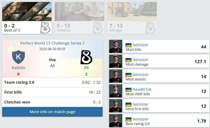 B8 полностью контролировали игру, не оставив шансов сопернику. Лучшим игроком встречи стал kensizor, оформивший 44 убийства, 127.1 среднего урона и 12 первых фрагов. Также headtr1ck отметился 13 убийствами с AWP.