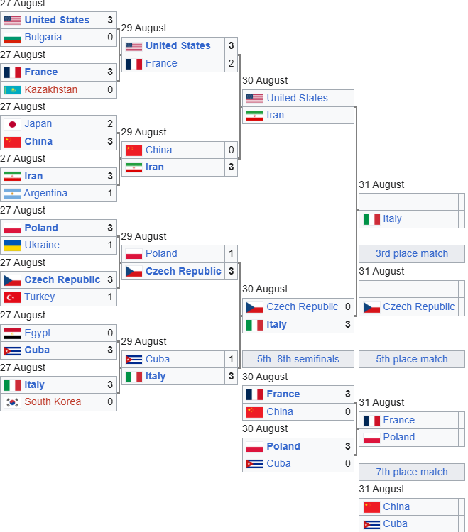 В полуфинале Италия встретится с победителем противостояния Иран – США. Чехия же поборется за бронзовые награды с командой, которая уступит в этой паре.
