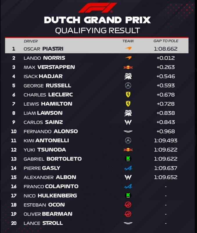 Состоялась квалификация Формулы-1 в рамках Гран-при Нидерландов. Поул завоевал пилот Макларена Оскар Пиастри, который в решающем сегменте опередил напарника Ландо Норриса на 0,012 секунды.