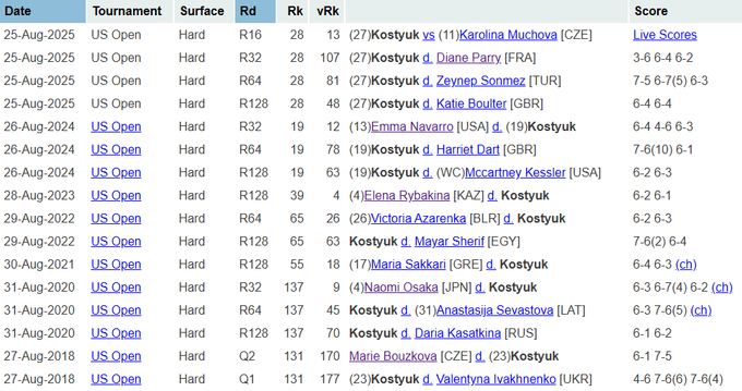 Костюк на USO-2025, помимо Парри, также одолела Кэти Бултер и Зейнеп Сонмез. Ее следующей соперницей будет 13-я ракетка мира Каролина Мухова.