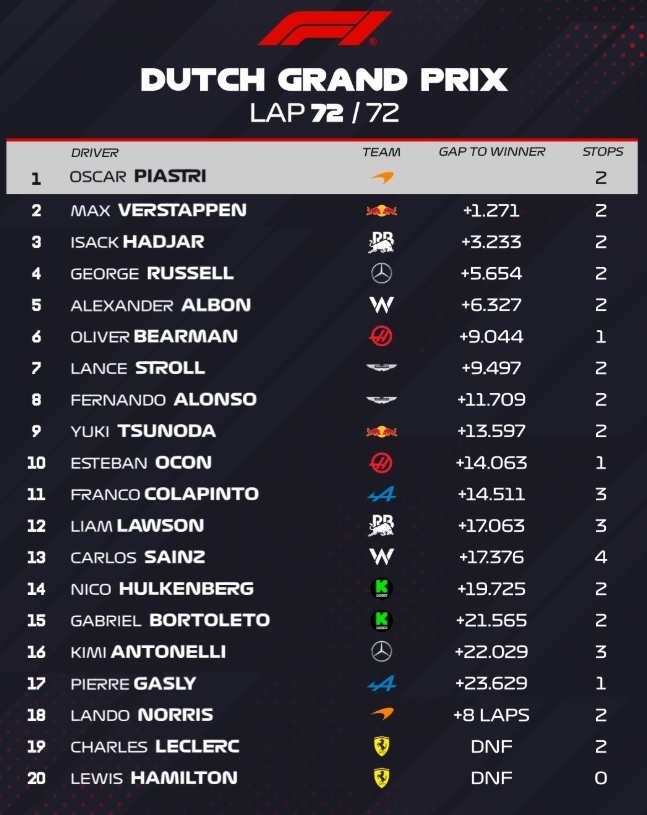 Состоялась гонка Формулы-1 в рамках Гран-при Нидерландах. Победителем стал пилот Макларена Оскар Пиастри, который был быстрее напарника Ландо Норриса.