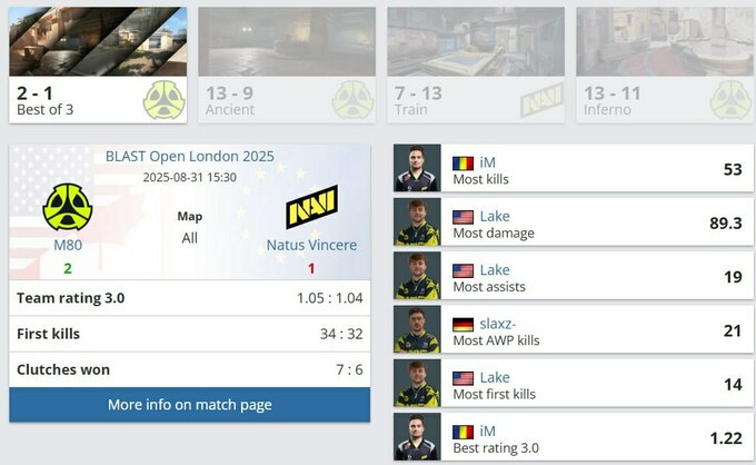 Команда M80 сотворила громкий апсет, выбив Natus Vincere с турнира BLAST Open London 2025. В этой серии североамериканский состав обыграл соперника со счетом 2:1, выиграв Ancient (13:9) и Inferno (13:11) после поражения на Train (7:13).