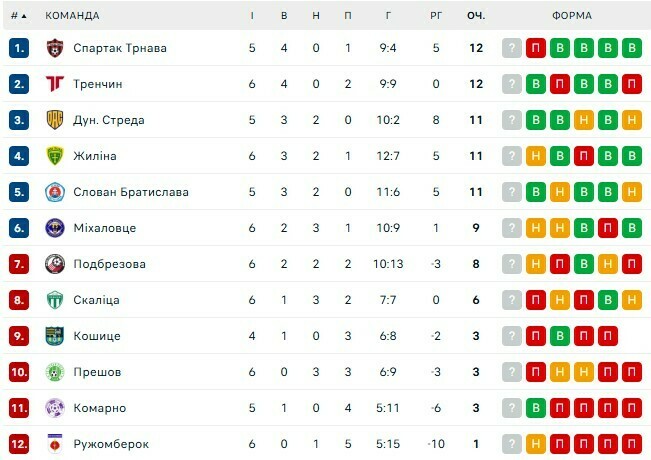 Лидеры чемпионата Словакии: Спартак Трнава, Тренчин (по 12), ДАК 1904, Жилина, Слован (по 11).