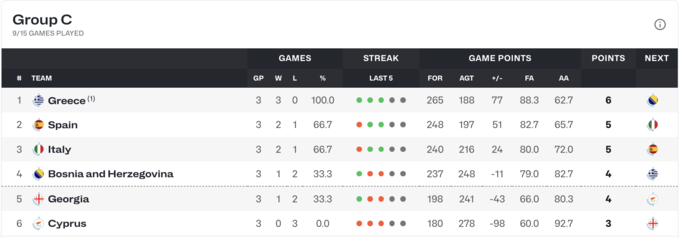 В группе C сборная Испании одержала разгромную победу над Кипром (91:47) с разницей в 44 очка. Греция уверенно переиграла Грузию – 94:53, а Италия оказалась сильнее Боснии и Герцеговины – 96:79.