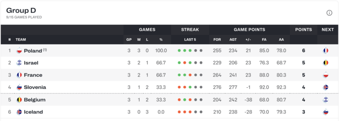 Израиль победил Францию – 82:69, а Польша одержала верх над Исландией – 84:75.