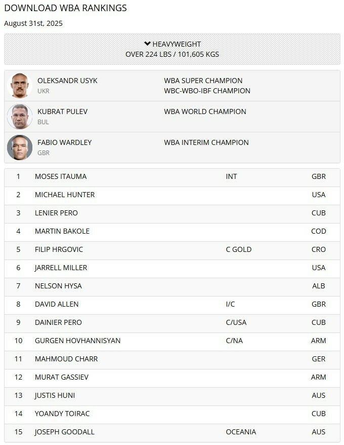 Представитель США Майкл Хантер потерял статус лидера и опустился на второе место. На первую позицию поднялся непобежденный британский супертяж Мозес Итаума, который в последнем поединке уничтожил своего соотечественника Диллиана Уайта нокаутом в первом раунде.