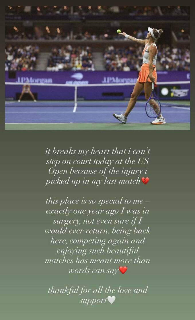 «Мое сердце разбито от того, что я не могу сегодня выйти на корт на US Open из-за травмы, которую получила в своем последнем матче.