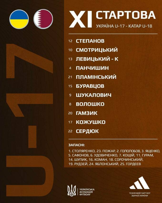 Украина U-17 (1-й тайм): Степанов, Гамзик, Буравцов, Шукалович, Волошко, Кожушко, Смотрицкий, Левицкий (к), Панчишин, Пламинский (Гололобов, 30), Сердюк.