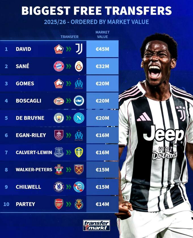 Лидером стал Джонатан Дэвид, перешедший в туринский «Ювентус». Бывший нападающий «Лилля» оценивается на Transfermarkt в 45 миллионов евро.