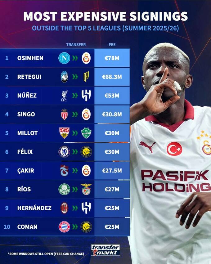 На вершине рейтинга оказался нигерийский форвард Виктор Осимхен, который стал игроком турецкого «Галатасарая» за 78 миллионов евро. Предыдущим клубом Виктора был «Наполи».