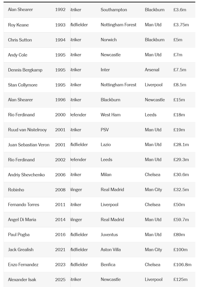 Портал The Athletic подготовил таблицу всех трансферных рекордов в истории АПЛ.