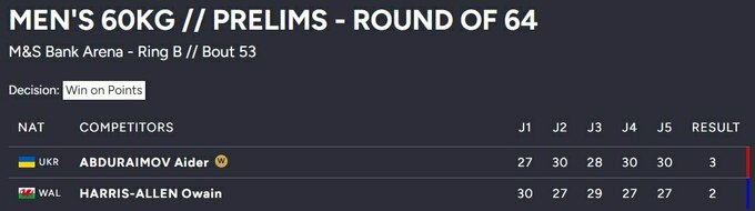 Первый поединок на турнире провел украинский боксер Айдер Абдураимов, который выступает в весовой категории до 60 кг. Он вышел на ринг против валлийца Овейна Харриса-Аллена и одержал непростую победу со счетом 3:2.