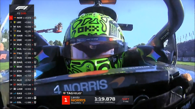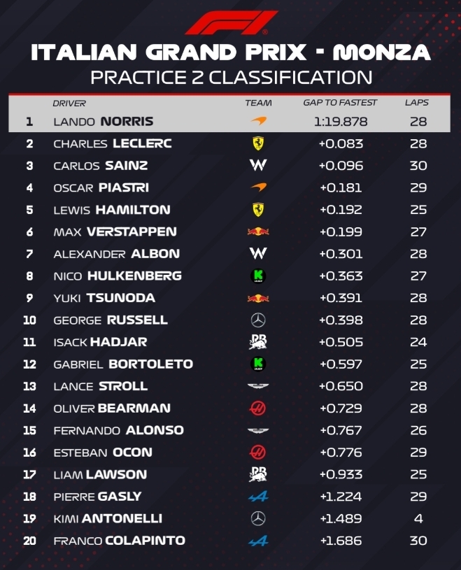 Во второй тренировке лучшим был гонщик Макларена Ландо Норрис. Британец опередил Леклера и Сайнса, которые отстали всего на 0,1 секунды.