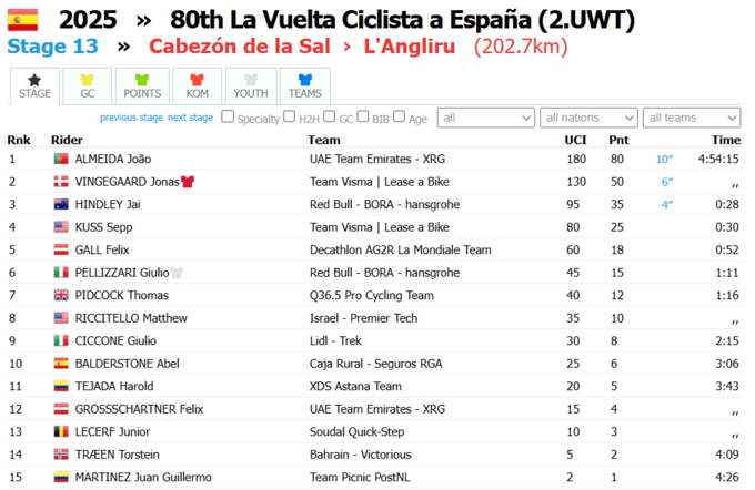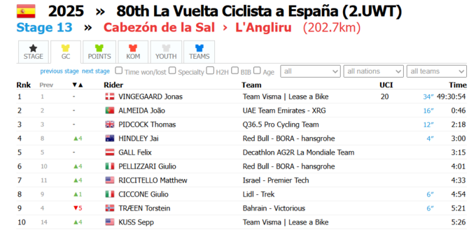 После 13-го этапа генеральную классификацию возглавляет Йонас Вингегор. Жоау Алмейда отстает на 46 секунд.