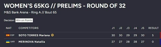 Наталья Меринова покинула чемпионат мира после неудачного боя с Марианной Сото Торрес, которая представляет Испанию. По итогам трех раундов все пять судей зафиксировали победу испанки. Бой прошел в категории до 65 кг.