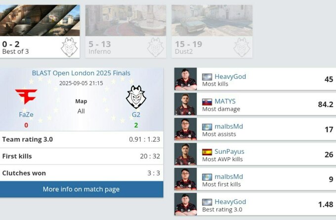 G2 вышли в полуфинал BLAST Open London 2025, обыграв FaZe со счетом 2:0 по картам. На своем пике Inferno они уверенно победили 13:5, а на Dust2 довели дело до успеха во втором овертайме – 19:15.