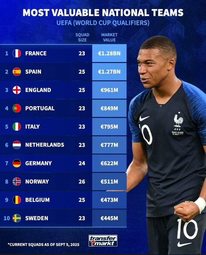 Известный портал Transfermarkt опубликовал рейтинг самых дорогих национальных команд на стадии квалификации к ЧМ-2026. Лидером списка стала сборная Франции, которая оценивается в 1,28 млрд евро (23 игрока). Самым дорогим в составе «синих» является Килиан Мбаппе – 180 млн евро.
