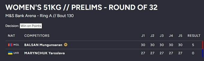 В весовой категории до 51 кг Ярослава Маринчук встретилась с Мунгунсаран Бальсан с Монголии – украинка продержалась три раунда, но уступила единогласным решением судей и вылетела из турнира на стадии 1/16 финала.