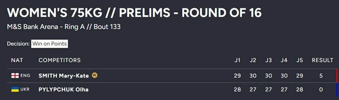 Ольга Пилипчук провела бой в весовой категории до 75 кг против представительницы Великобритании Мэри-Кейт Смит за выход в 1/8 финала. По итогам трех раундов все пять судей зафиксировали единогласную победу соперницы украинки. Поединок прошел в лимите до 75 кг.