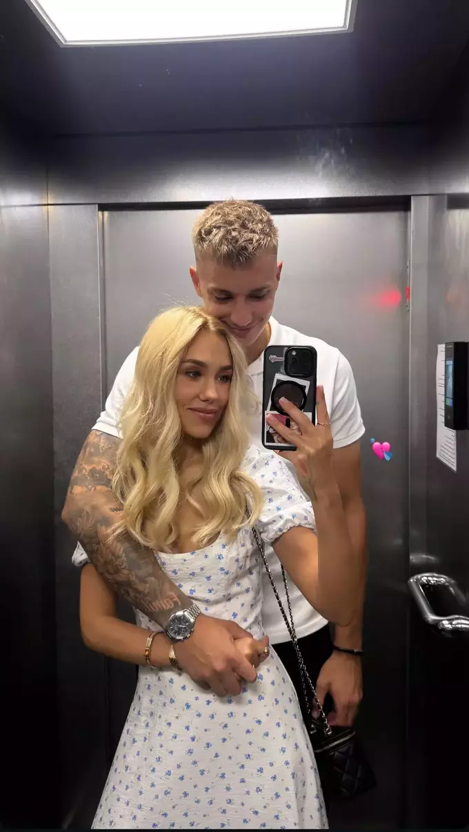 Пара сделала кадр в лифте – они нежно улыбаются и обнимаются.