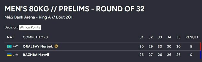 Второй бой на турнире провел представитель весовой категории до 80 кг Матвей Ражба, который встретился с Нурбеком Оралбаем из Казахстана. Украинец потерпел поражение на стадии 1/16 финала единогласным решением судей (0:5) и покинул чемпионат мира в Англии.