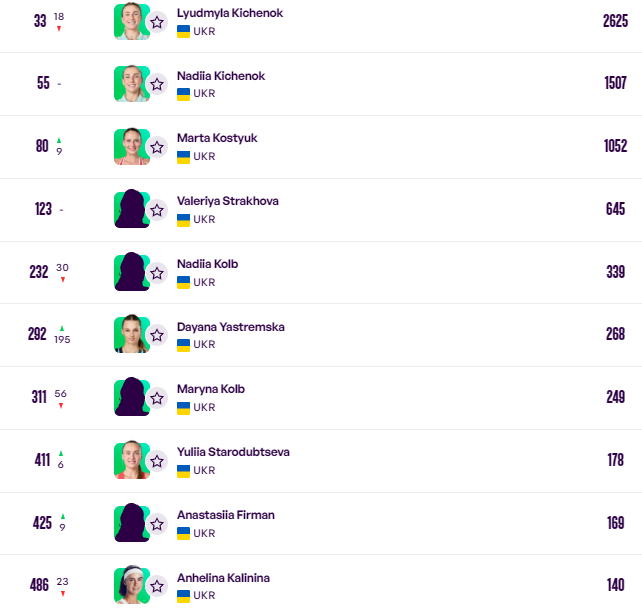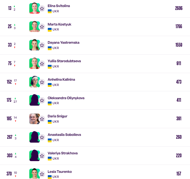 Элина поднялась на 13-е место, Марта – на 25-е, Ястремская опустилась на 33-е