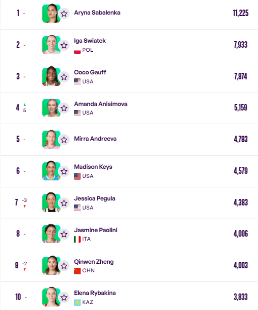 Из изменений в первой десятке: Джессика Пегула опустилась на три места и идет седьмой, Чжэн Циньвень потеряла две строчки – она девятая.