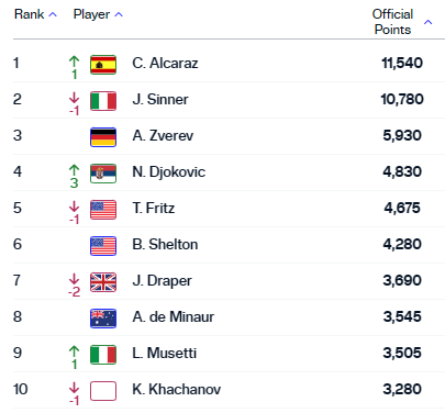 Из других изменений в топ-10: Тейлор Фритц опустился на пятое место, Джек Дрейпер потерял две строчки и идет седьмым, рокировка Лоренцо Музетти и Карена Хачанова – итальянец стад девятым, а «нейтрал» – десятым.