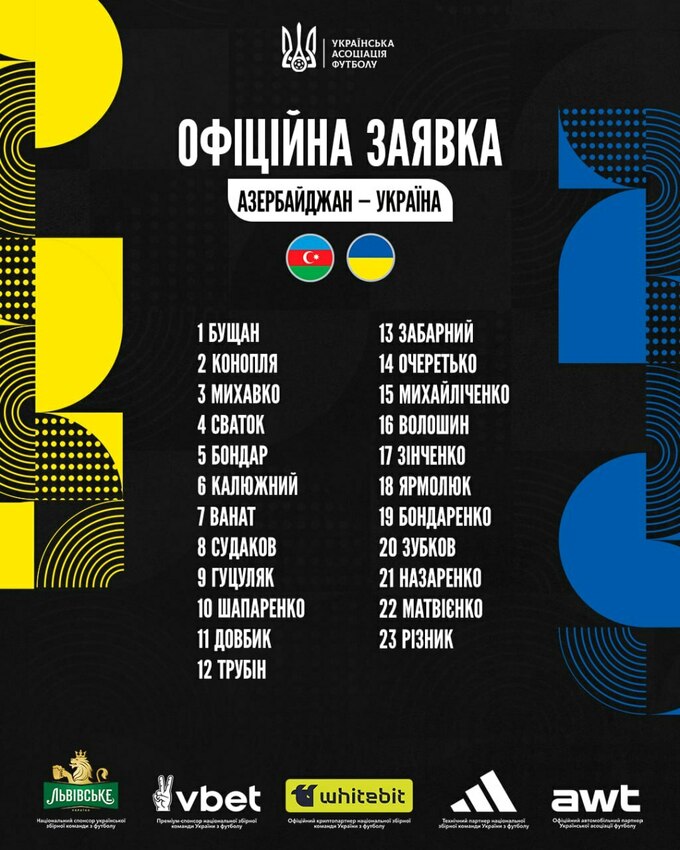 Главный тренер «сине-желтых» Сергей Ребров определился с заявкой на этот матч. Обошлось без изменений по сравнению с матчем против Франции – из общей заявки отсутствует только Владислав Дубинчак, Виктор Цыганков покинул расположение команды.