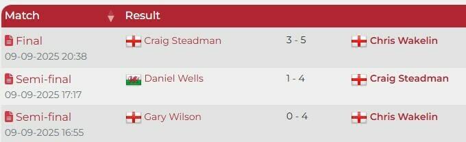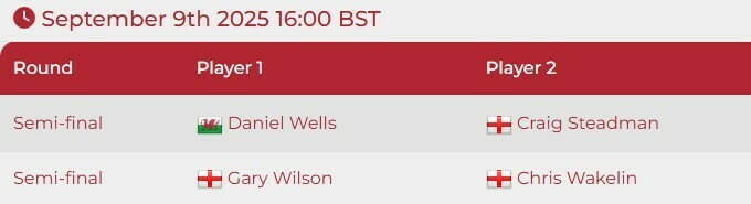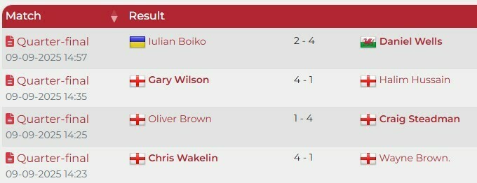 В других парах 1/4 финала зафиксированы такие результаты: Оливер Браун – Крейг Стедман – 1:4, Гэри Уилсон – Халим Хуссейн – 4:1, Крис Вейклин – Уэйн Браун – 4:1. В полуфиналах 9 сентября в 18:00 сыграют: Дэниел Уэллс – Крейг Стедман, Гэри Уилсон – Крис Вейклин.