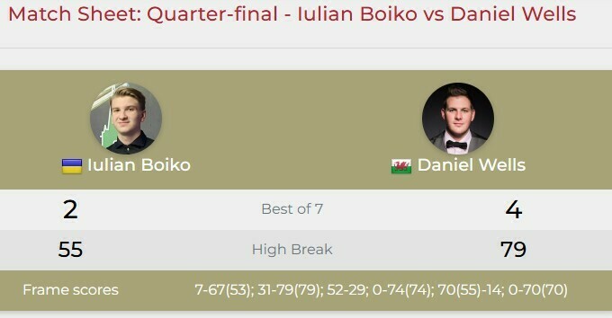 19-летний Юлиан Бойко в 1/4 финала 9 сентября в 15:00 уступил в матче против 37-летнего Дэниела Уэллса из Уэльса (2:4), который в карьере трижды доходил до полуфиналов рейтинговых турниров.