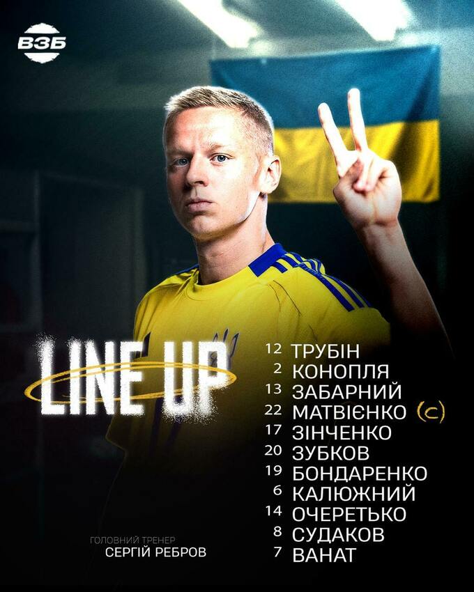 Главный тренер сине-желтых Сергей Ребров назвал стартовый состав своих подопечных, внеся три изменения по сравнению с игрой против Франции.