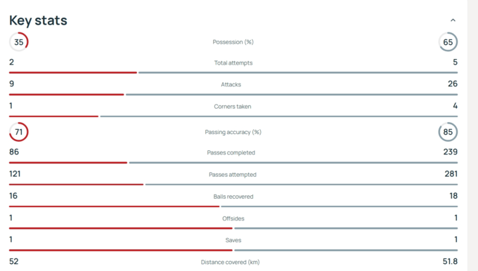 Команда Сергея Реброва больше контролировала мяч (65% на 35%), однако нанесла лишь один удар в створ ворот – в конце тайма пробил Александр Зубков, а мяч после рикошета прилетел в руки вратарю.