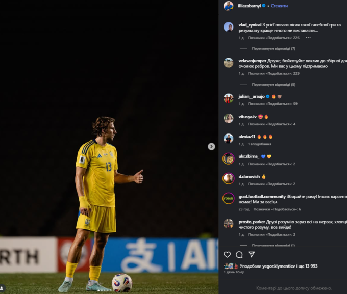 После поединка украинский защитник Илья Забарный в своем Instagram опубликовал подборку фотографий с матча, но никак не прокомментировал позорный для команды результат. Большое количество фанатов резко отреагировало на такие действия футболиста и начало хейтить его в комментариях под публикацией.