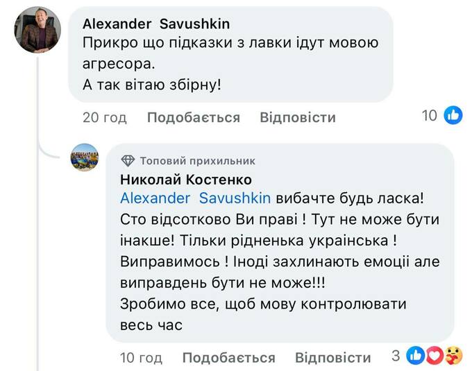 Костенко извинился перед фанатом и пообещал, что впредь с уст тренеров будет звучать только украинский язык: