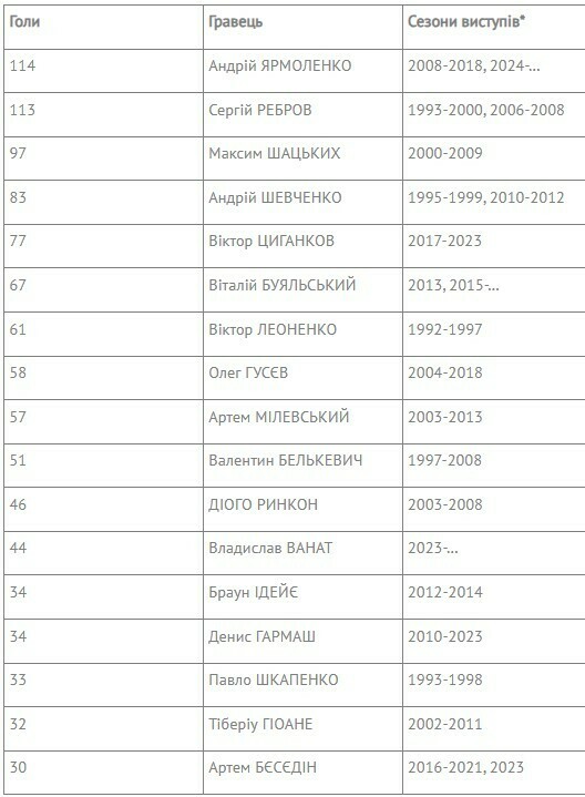 В топ-5 входят: Андрей Ярмоленко, Сергей Ребров, Максим Шацких, Андрей Шевченко, Виктор Цыганков.