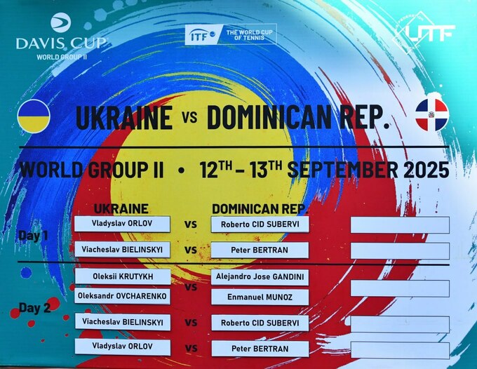 12–13 сентября мужская сборная Украины по теннису проводит матчевое противостояние Второй Мировой группы Кубка Дэвиса против команды Доминиканской Республики.