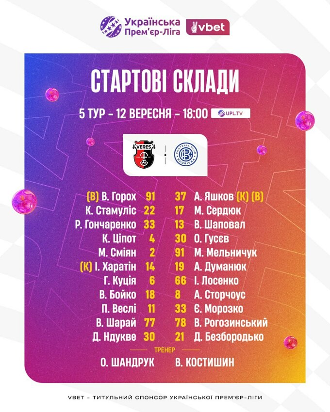 Стартовые составы команд на матч «Верес» – «Кудровка»