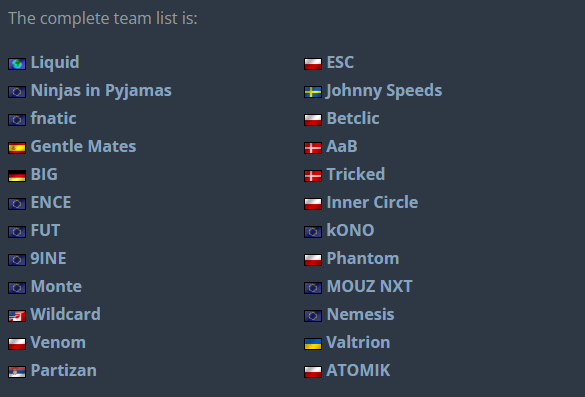 Среди участников – такие известные клубы, как ENCE, Ninjas in Pyjamas, fnatic и Liquid. К ним в последний момент присоединились Gentle Mates, которые заменили OG.