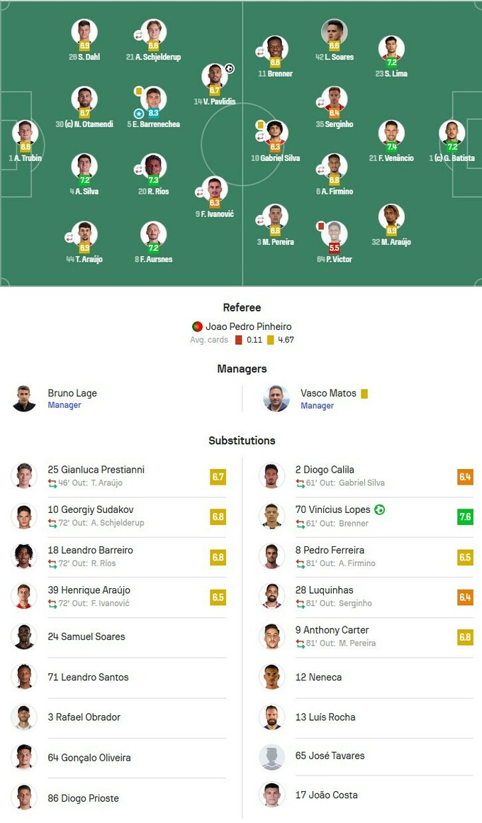 Новичок Бенфики Судаков получил 6.8 от SofaScore, а игра Трубина оценена в 6.6 балла.