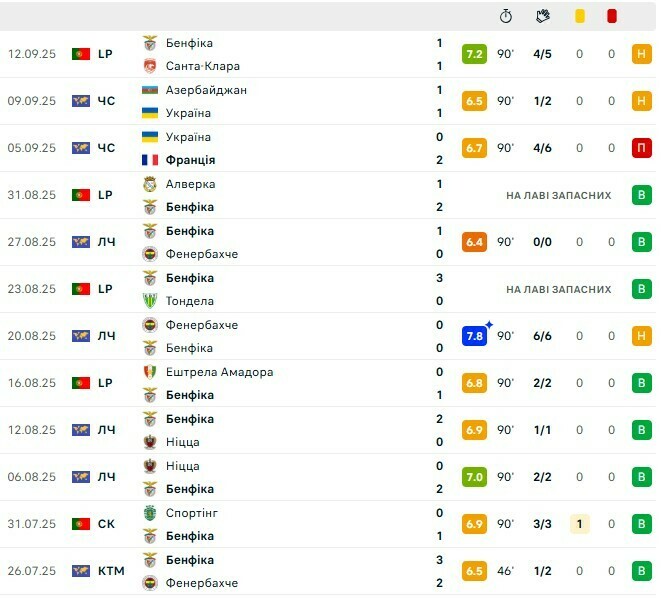 - 27 августа 2025 – Лига чемпионов: Фенербахче (1:0)
