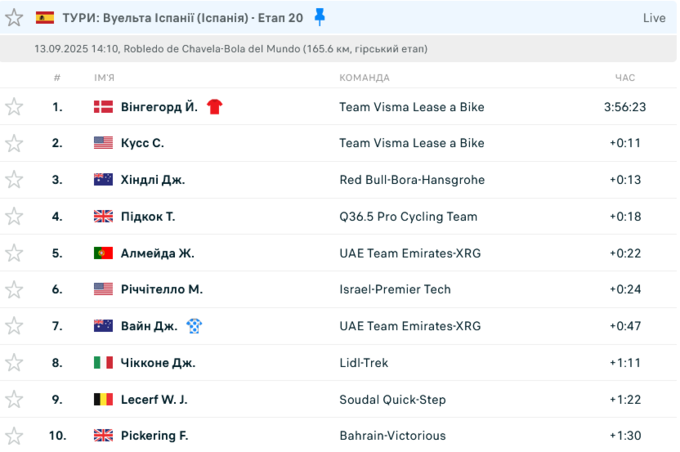 В субботу, 13 сентября, прошел 20-й этап шоссейного гранд-тура Вуэльта Испании 2025. Победу одержал представитель команды Team Visma Lease a Bike Йонас Вингегор.