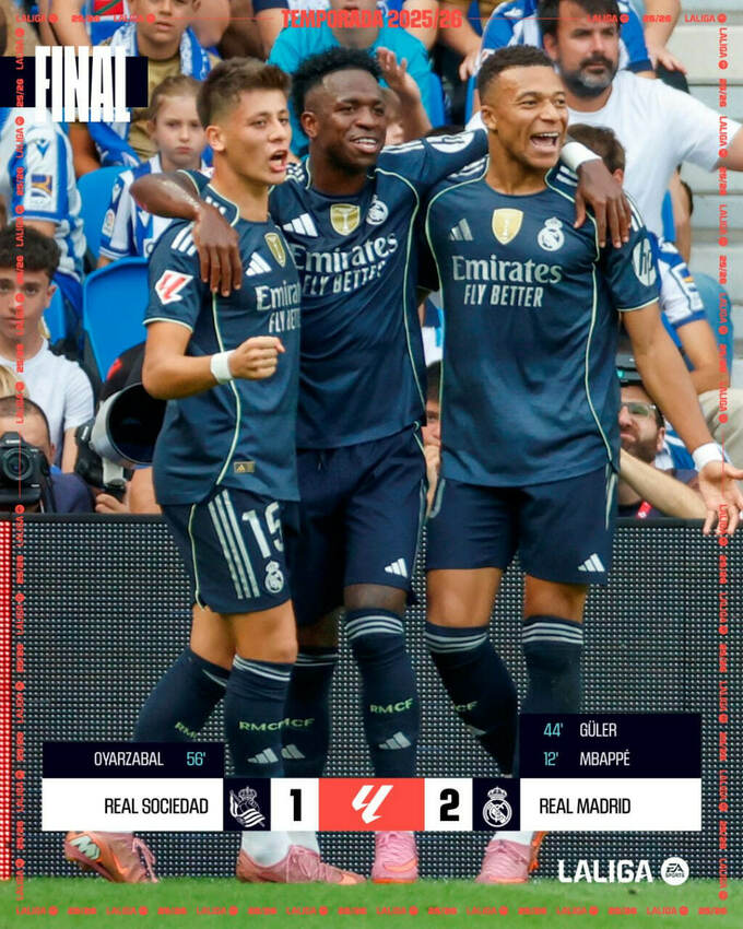 Реал одержал четвертую победу в четырех стартовых матчах нового сезона чемпионата Испании и уверенно возглавляет таблице с 12 очками. У Сосьедада всего два пункта, команда потерпела второе поражение в кампании 2025/26.